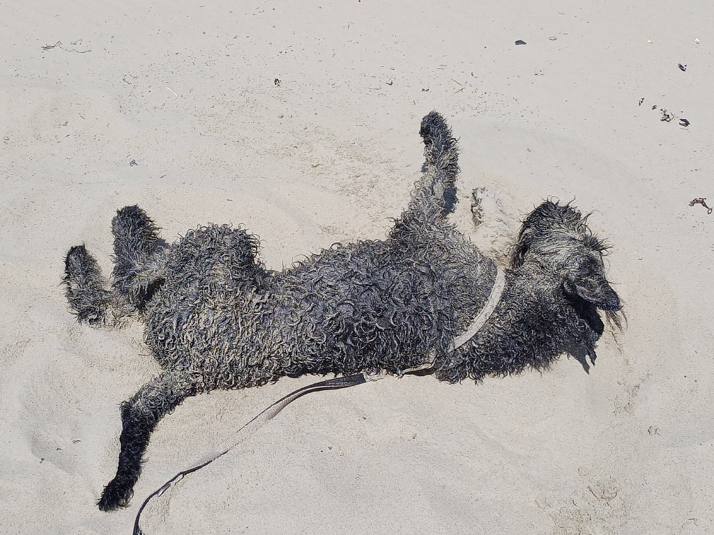 Pudelnass nahm er dann ein ausgiebiges Sandbad um sich abzutrocknen. Ein Bild für die Götter, denn in diesem Zustand hatte er mehr Ähnlichkeit mit einer nassen Ratte als mit einem stolzen Kerry.